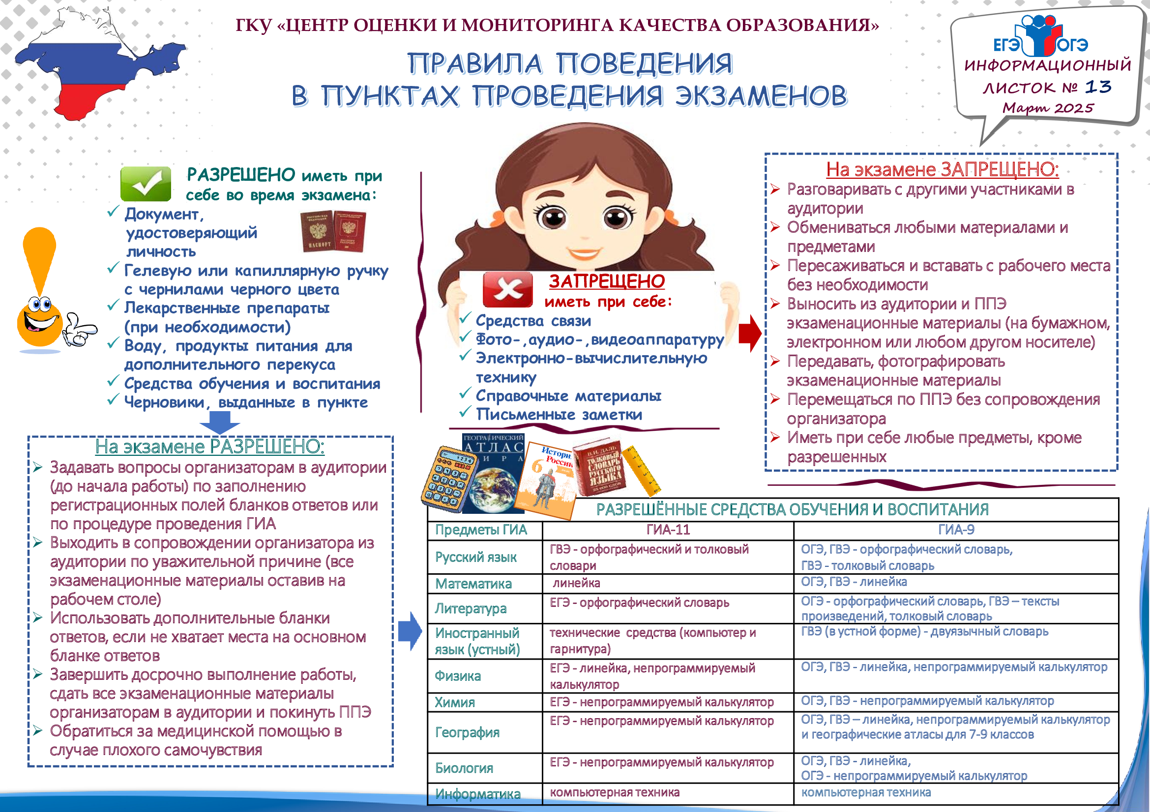 Явиться на пункт проведения экзаменов (ППЭ) в 8.45(адрес ППЭ выпускник узнает из уведомления, которое выдается в ОО)с: ü документом, удостоверяющим личность (паспортом); ü черными гелевыми ручками; ü разрешенным для использования на экзамене по предмету дополнительным оборудованием; водой и лекарствами (при необходимости). | |
