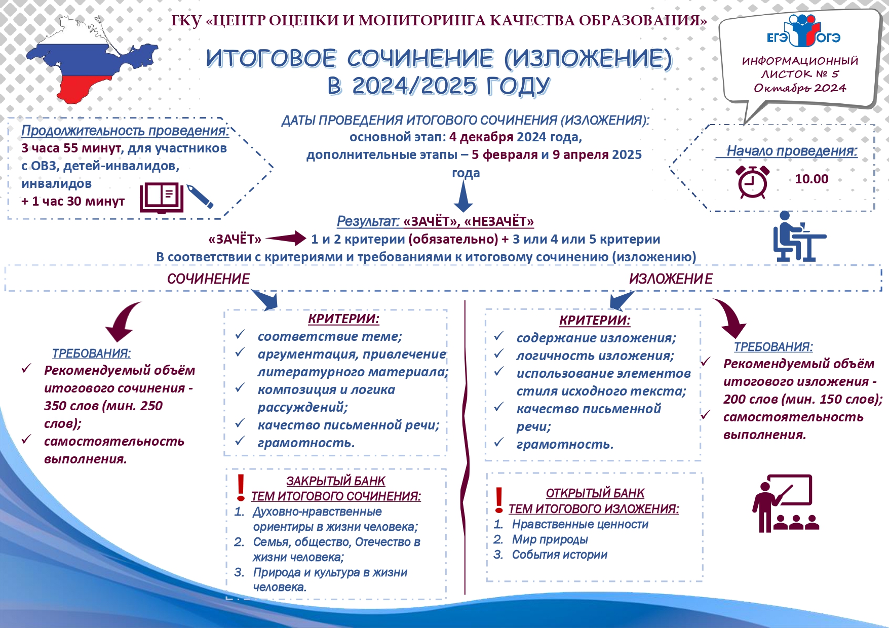 Итоговое сочинение (изложение) состоится: основной этап: 4 декабря 2024 года, дополнительные этапы –5 февраляи9 апреля2025года.